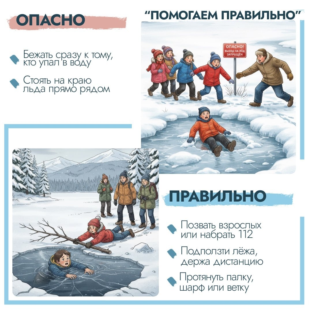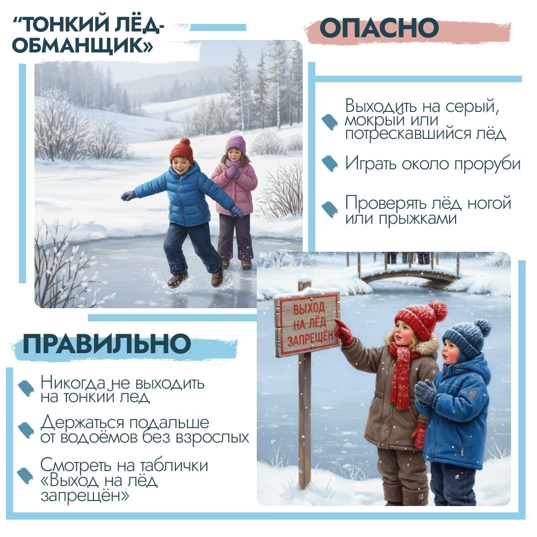 Зима — время весёлых игр! Чтобы катания на горках и прогулки возле льда были безопасными, важно помнить простые правила.