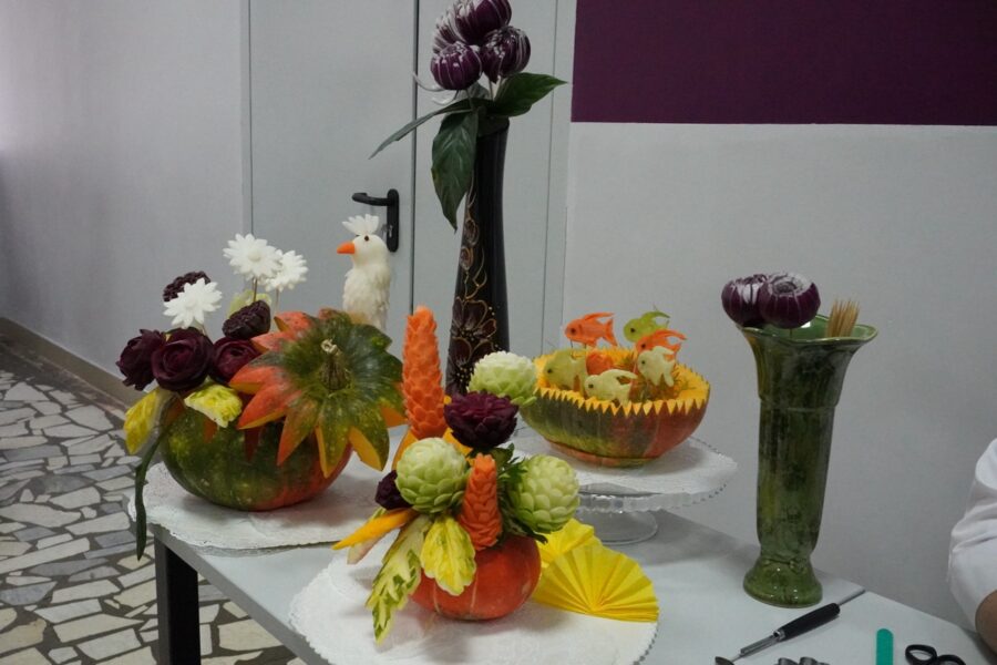 Под чутким руководством наших мастеров студенты вырезали из овощей невероятные узоры и фигуры. Это кропотливый труд, где важна каждая миллиметровая линия!