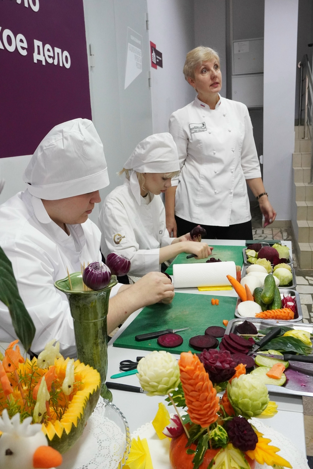 Под чутким руководством наших мастеров студенты вырезали из овощей невероятные узоры и фигуры. Это кропотливый труд, где важна каждая миллиметровая линия!